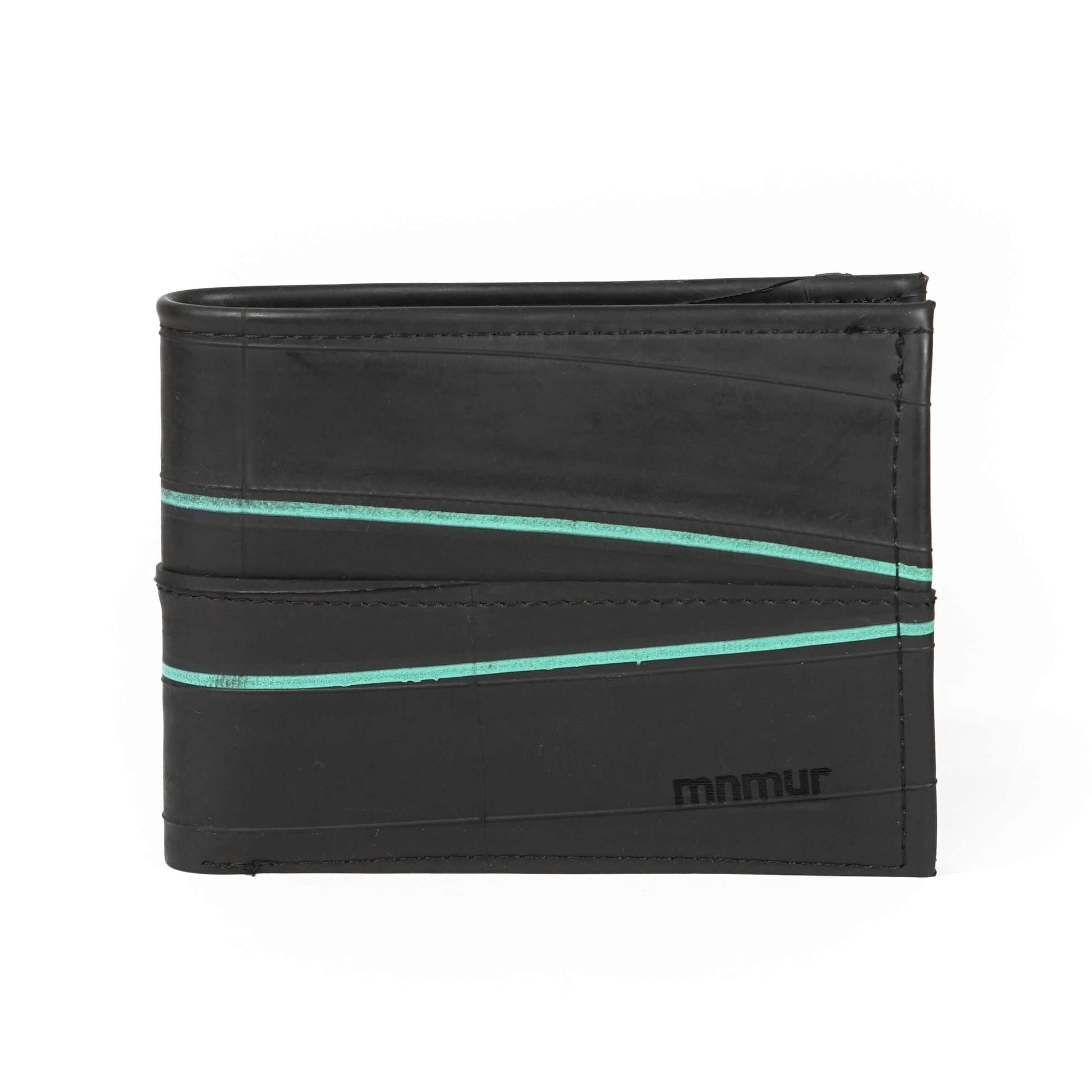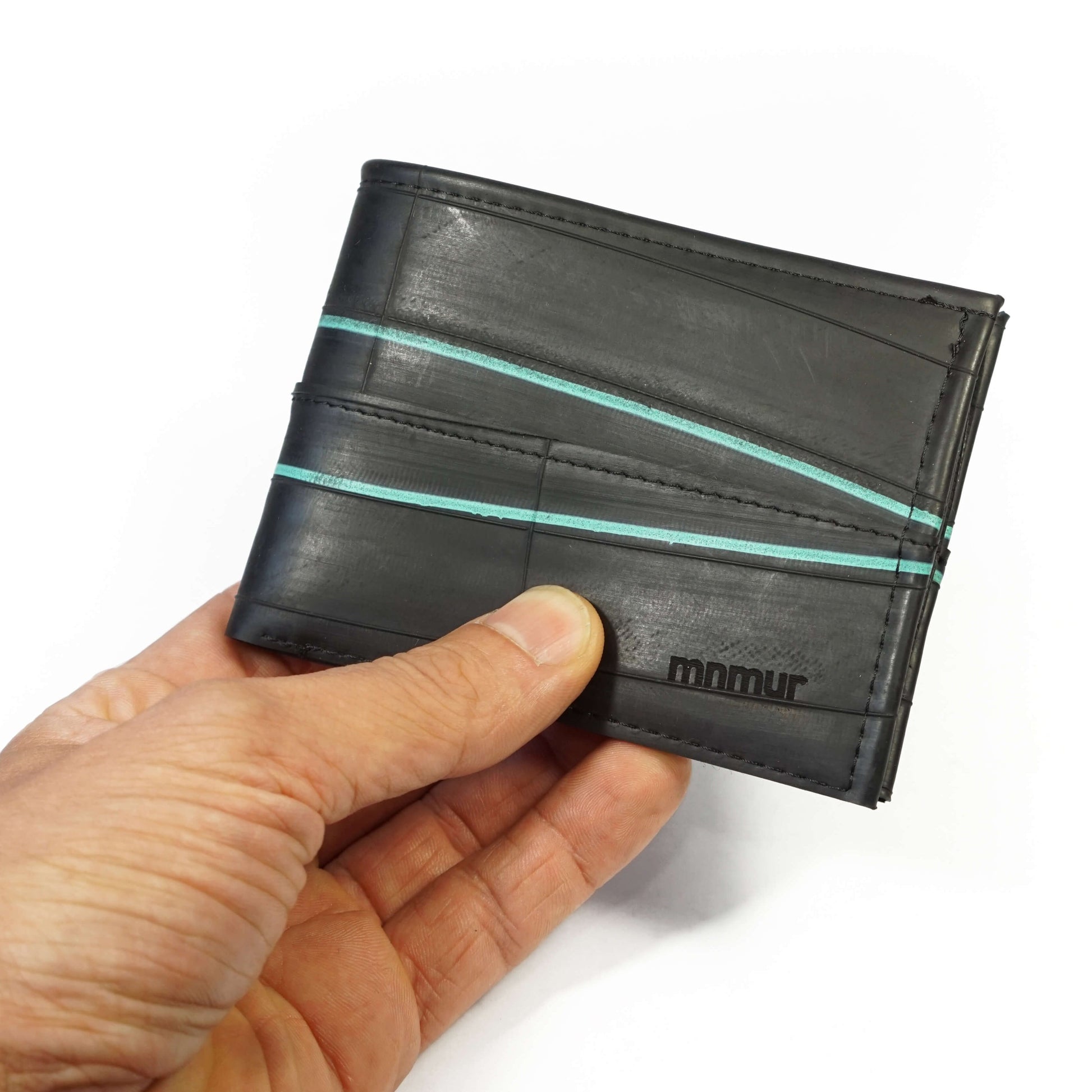 Portafoglio da uomo con portamonete, scomparti per tessere e spazio per banconote, realizzato a mano con camere d’aria di bicicletta. Il design di questo modello è arricchito da due linee blu originali, stampate direttamente sul materiale, che donano un tocco grafico unico e distintivo.