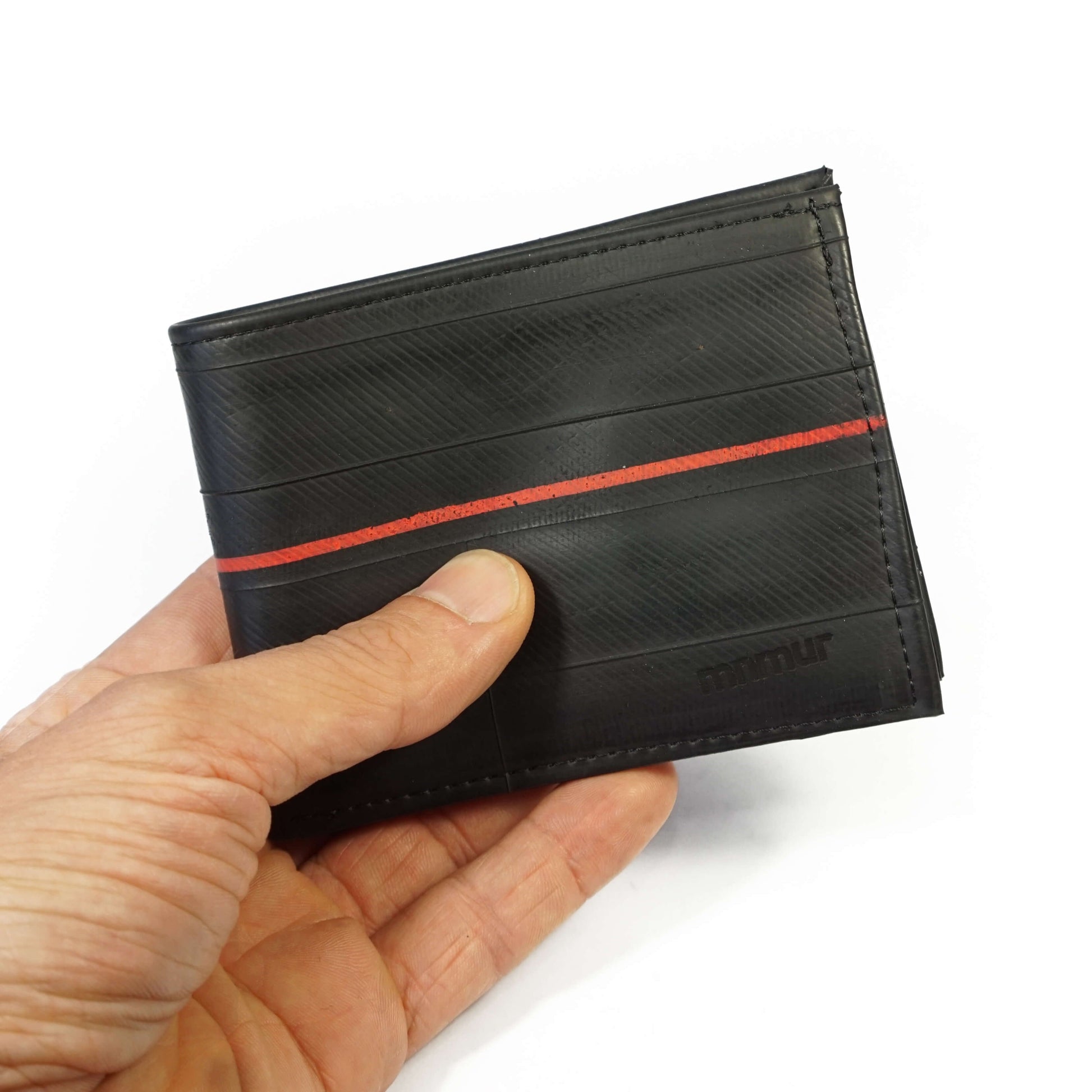 Portafoglio da uomo con portamonete, scomparti per tessere e spazio per banconote, realizzato a mano con camere d’aria di bicicletta. Il design di questo modello è arricchito da due linee blu originali, stampate direttamente sul materiale, che donano un tocco grafico unico e distintivo.