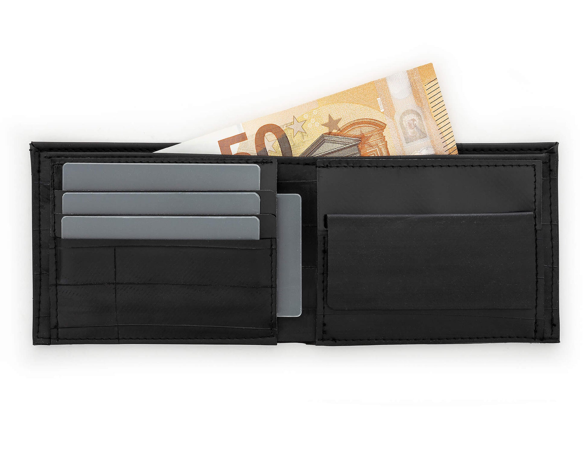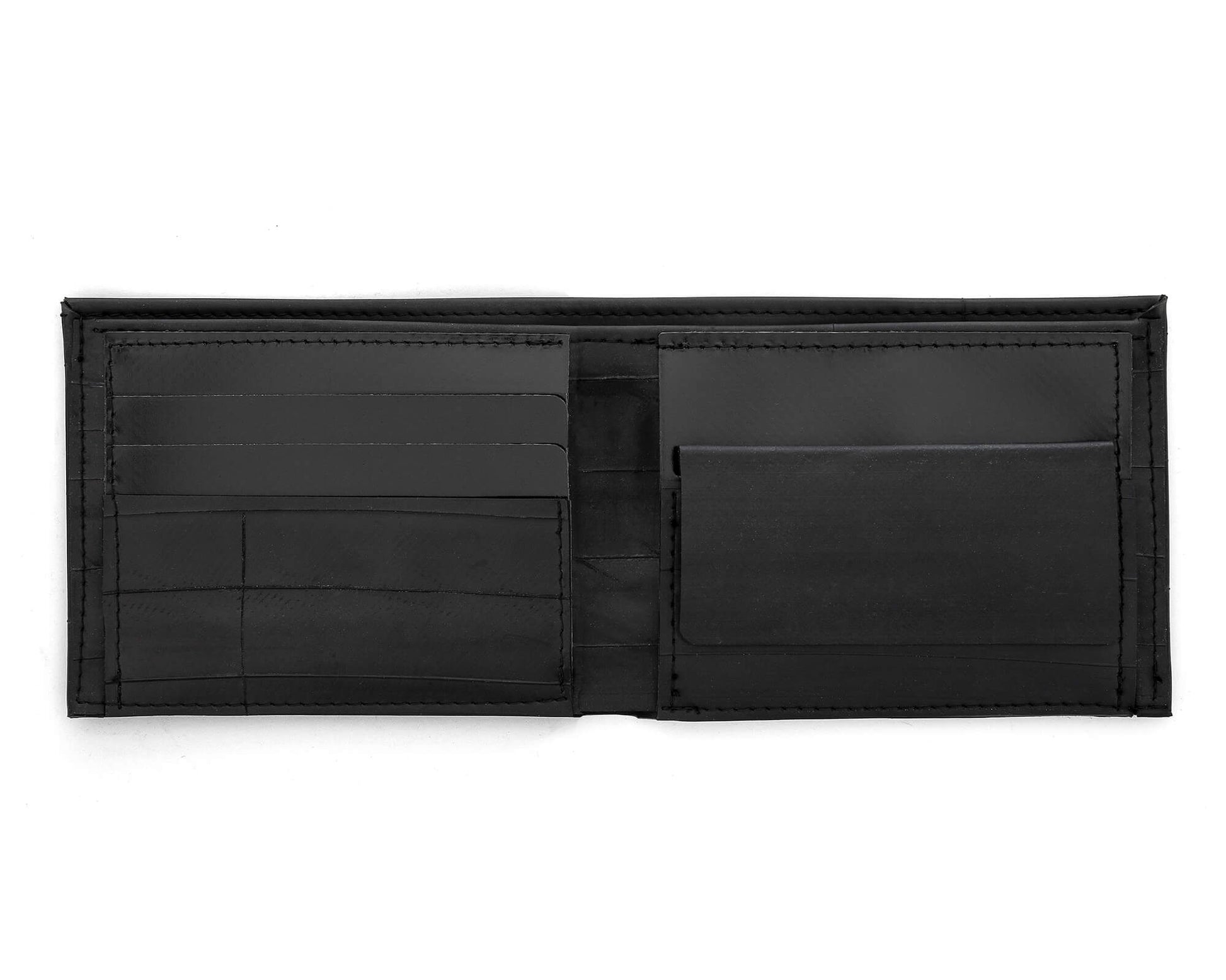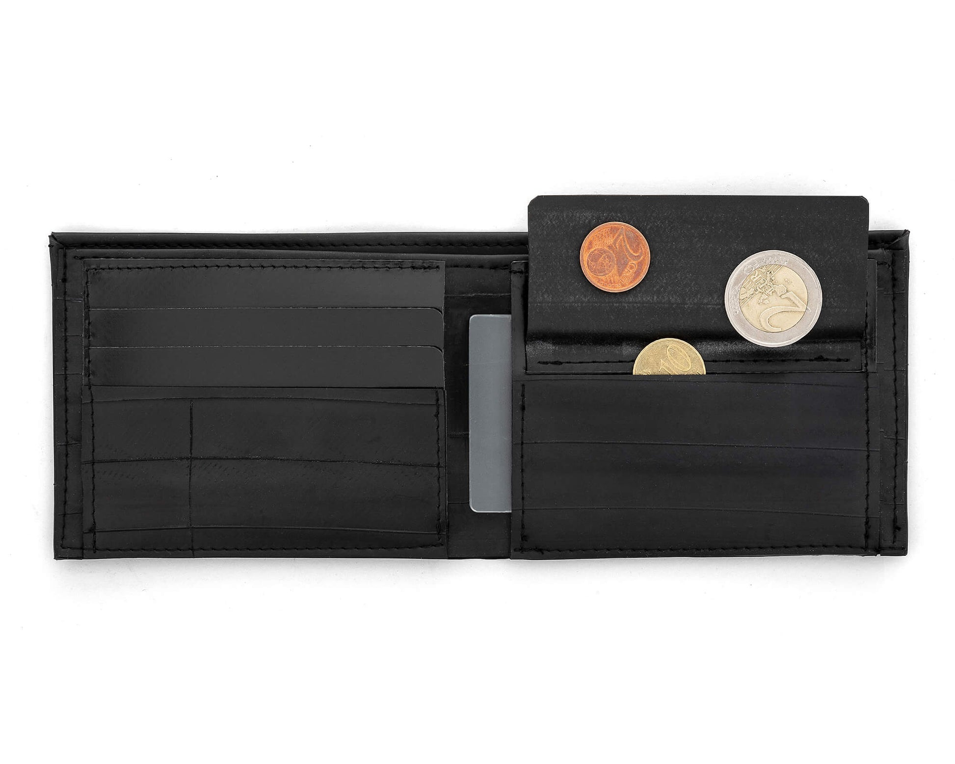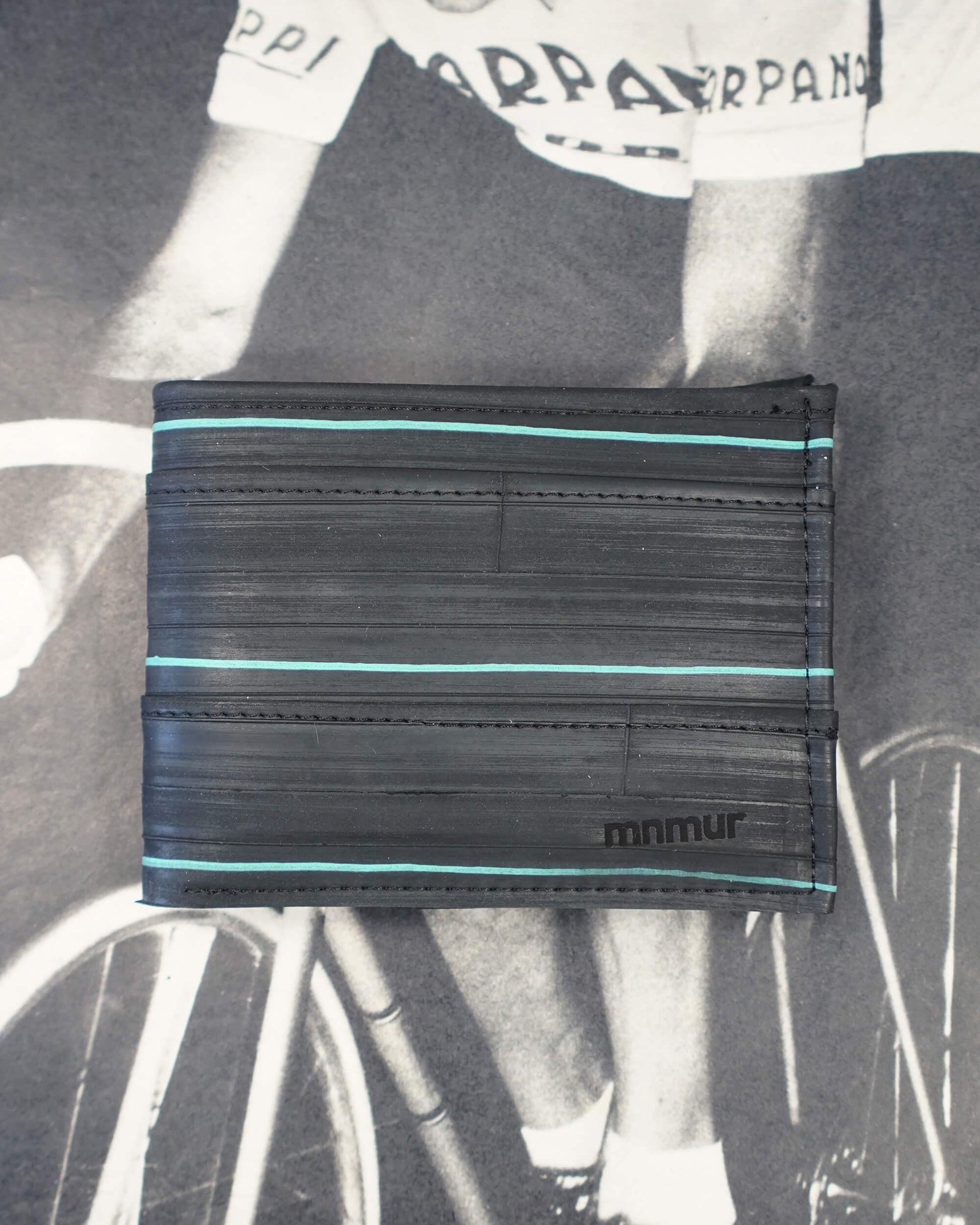 Portafoglio da uomo con portamonete, scomparti per tessere e spazio per banconote, realizzato a mano con camere d’aria di bicicletta. Il design di questo modello è arricchito da due linee blu originali, stampate direttamente sul materiale, che donano un tocco grafico unico e distintivo.
