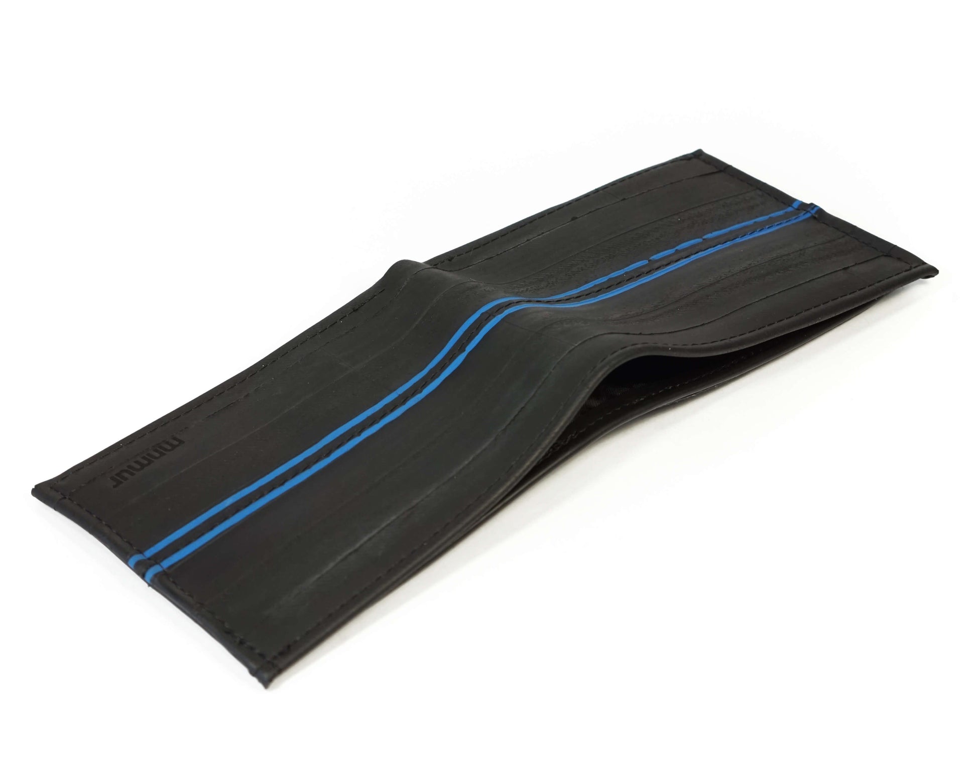 Portafoglio da uomo con portamonete, scomparti per tessere e spazio per banconote, realizzato a mano con camere d’aria di bicicletta. Il design di questo modello è arricchito da due linee blu originali, stampate direttamente sul materiale, che donano un tocco grafico unico e distintivo.