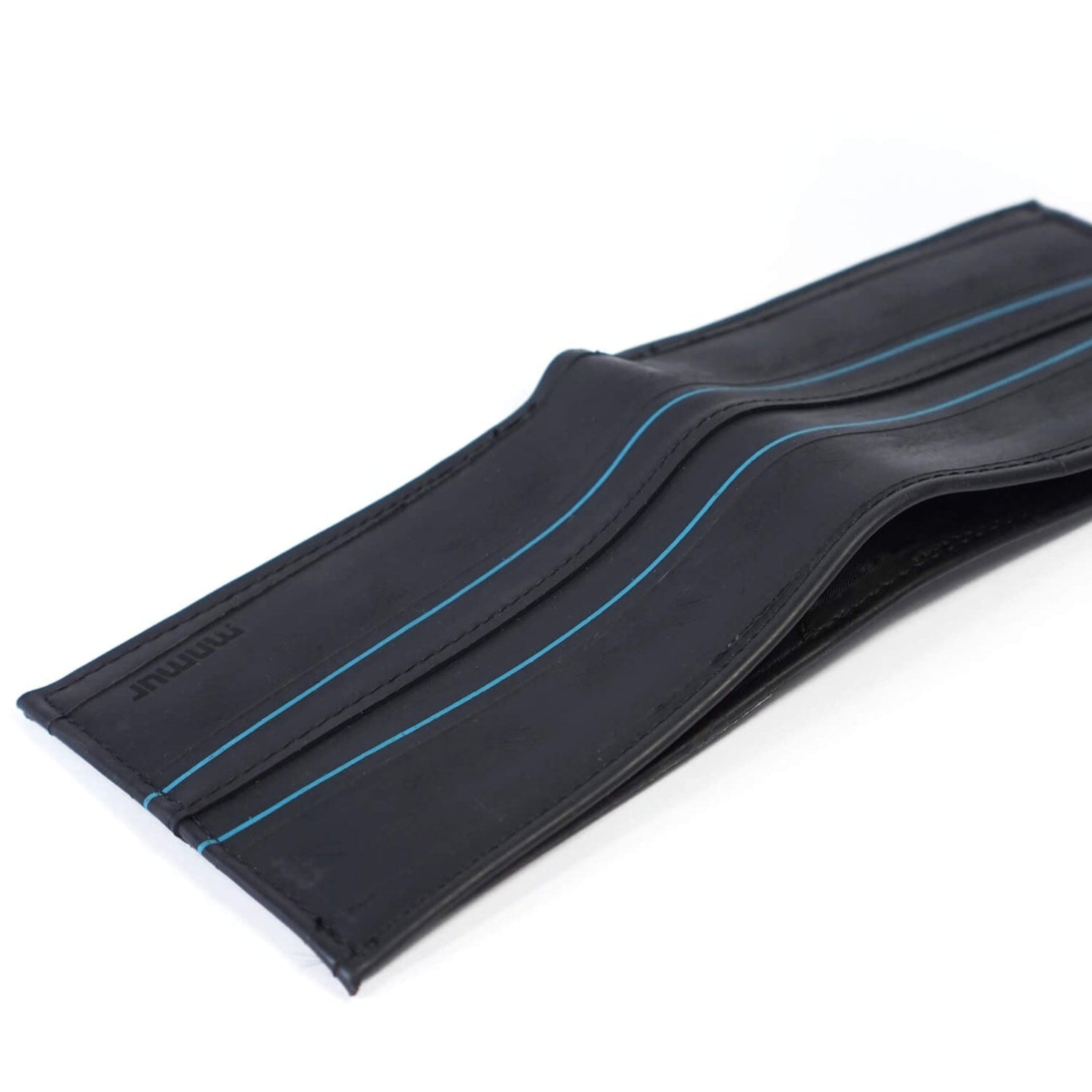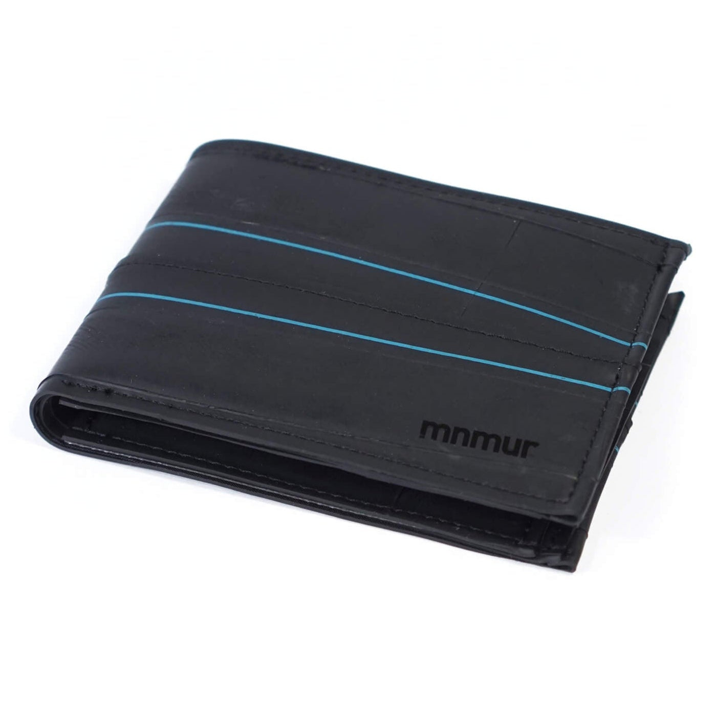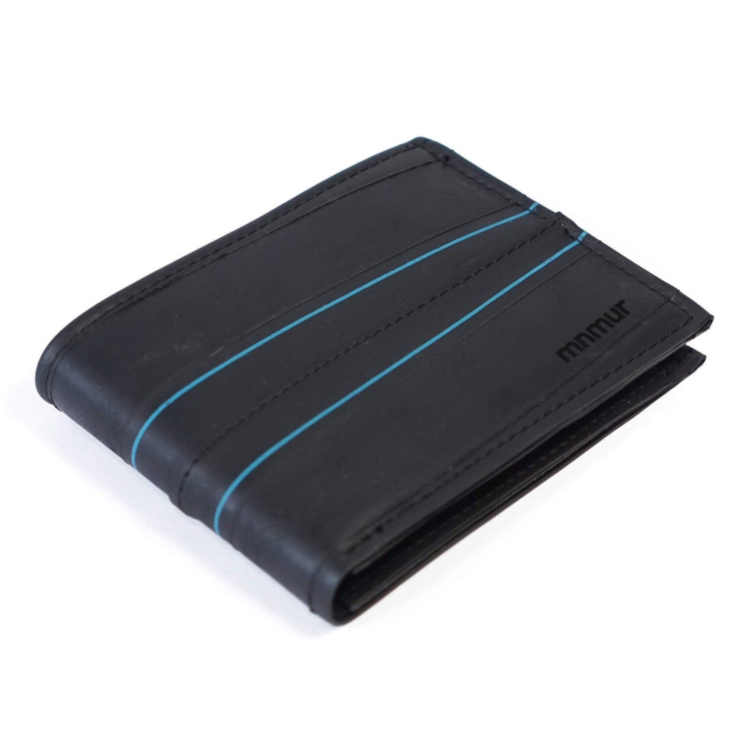 Portafoglio da uomo con portamonete, scomparti per tessere e spazio per banconote, realizzato a mano con camere d’aria di bicicletta. Il design di questo modello è arricchito da due linee blu originali, stampate direttamente sul materiale, che donano un tocco grafico unico e distintivo.